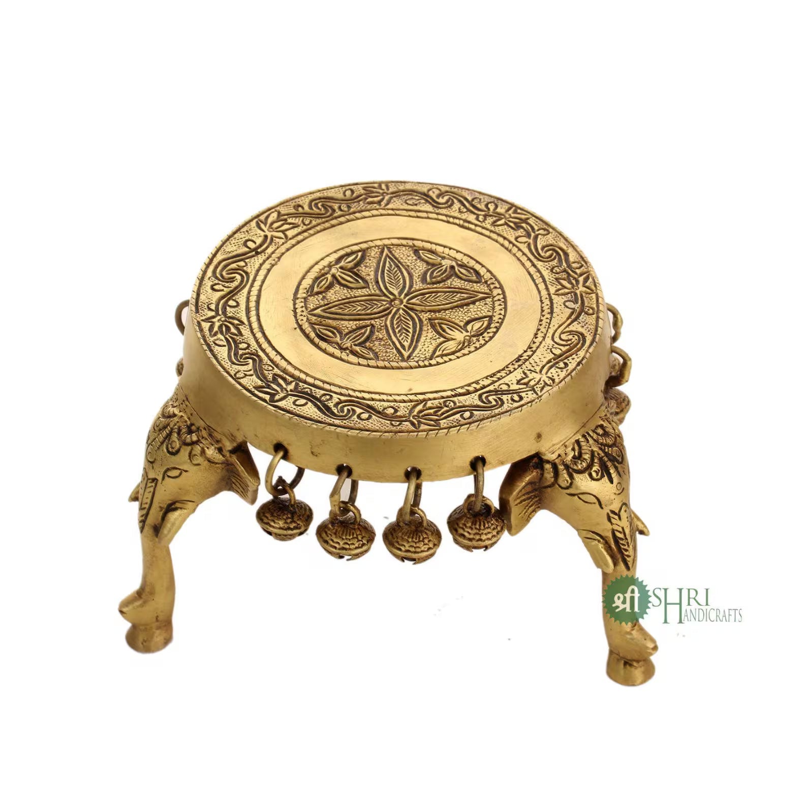 4 Inch Brass Elephant Chowki with Bells for Pooja & Home Décor