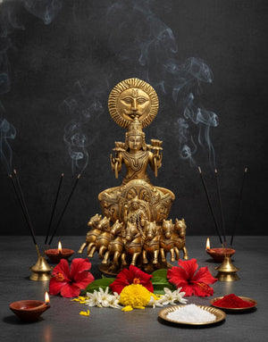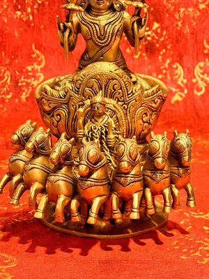 The 12"" Brass Surya Chariot features the Sun God Surya in his chariot, drawn by seven horses. This powerful representation symbolizes vitality, strength, and divine energy, invoking blessings of good health and prosperity.