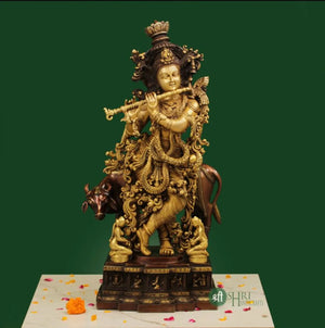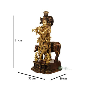 Bring home the eternal grace of Lord Krishna with his sacred companion, the Cow (Gau Mata), through this magnificent brass-colour handcrafted idol—a true masterpiece of devotion and artistry. Shown playing the flute in a tribhanga posture, Krishna embodies divine love, harmony, and spiritual bliss, while the cow symbolizes purity, abundance, and protection.