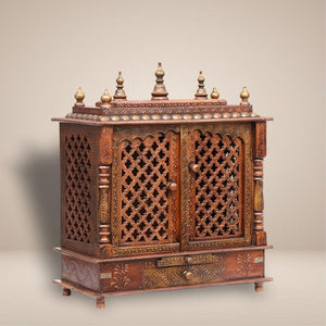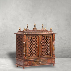Handcrafted Wooden Mandir for Home | Traditional Solid Wood Temple with Drawer | Antique Brown Jaali Design Hindu Pooja Mandir