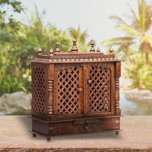 Add divine elegance and traditional charm to your sacred space with this handcrafted wooden mandir, beautifully carved from solid wood. Designed in rich antique brown with intricate jaali (lattice) patterns and hand-carved floral motifs, this temple captures the timeless beauty of Indian craftsmanship.